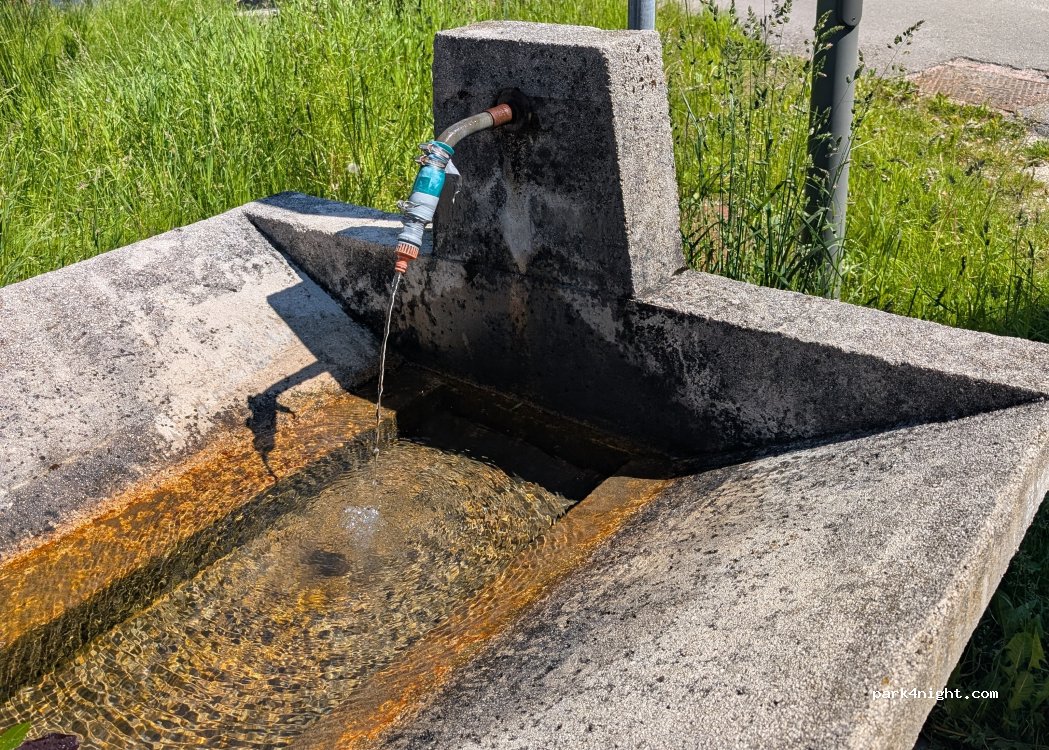 Fuente de agua con manguera. Hay estacionamiento disponible. El caudal es bajo, así que tenga paciencia. Pero dada la disponibilidad de agua en la zona, ¡la aprovechamos!