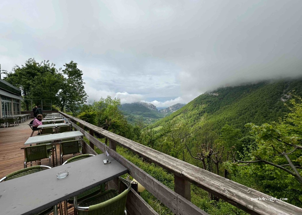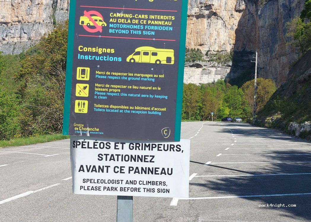 Paved car park of the Choranche cave. A part is allowed to motorhomes but reserved for cave customers. Not easy to find a flat place. Nice view.