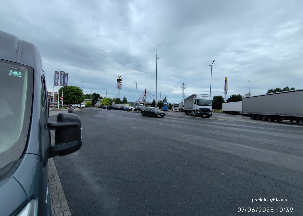 Fast food area, expensive gas station, restrooms, water intake where the picnic is, large parking lot