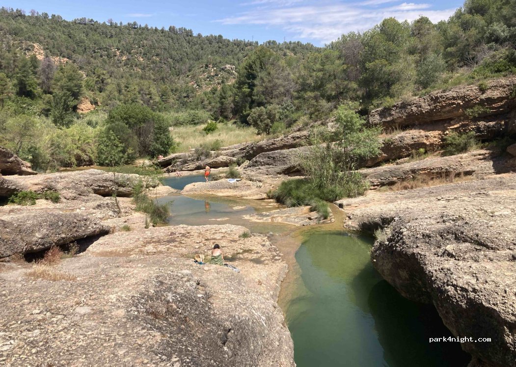 Les Olles. Perfect place. Very quiet and easily accessible. It is a typical place to bathe in summer, known by the inhabitants of the area. 4 km from the Horta de Sant Joan following the path of the convent and then towards Les Olles. There is a small parking lot very flat. To get to the end of the parking lot you have to go with 4x4, high van or short and high motorhome. We acceded to the place with high motorhome, about 35 cm.