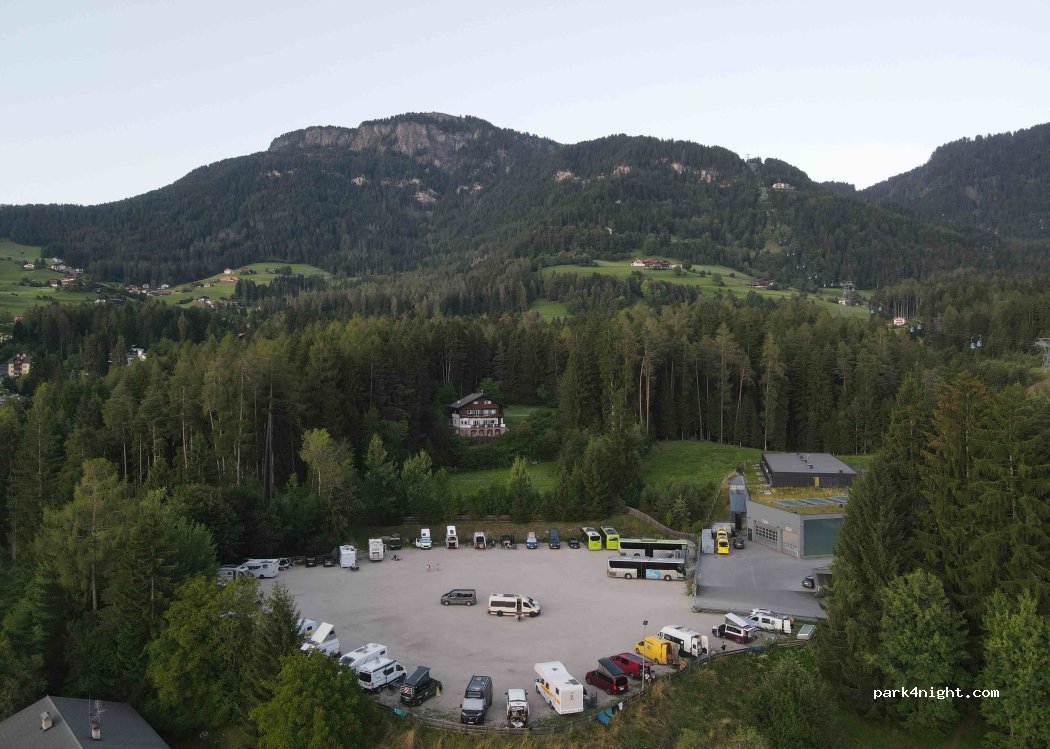 Belebter aber Perfekt gelegener Parkplatz um die Siaser Alm mit der Gondel zu erreichen. Um 20:30 geht die automatische Schranke zu. Zeitiges Kommen sichert gute Plätze, der Platz ist allerdings so groß das es ausreichend Parkmöglichkeiten gibt. Um 7 Uhr wird man sanft durchs Glockenklingeln der nahegelegenen Kirche geweckt. Ansonsten ist es Nachts sehr ruhig. WC zu Fuß im Gondelhaus zu erreichen.