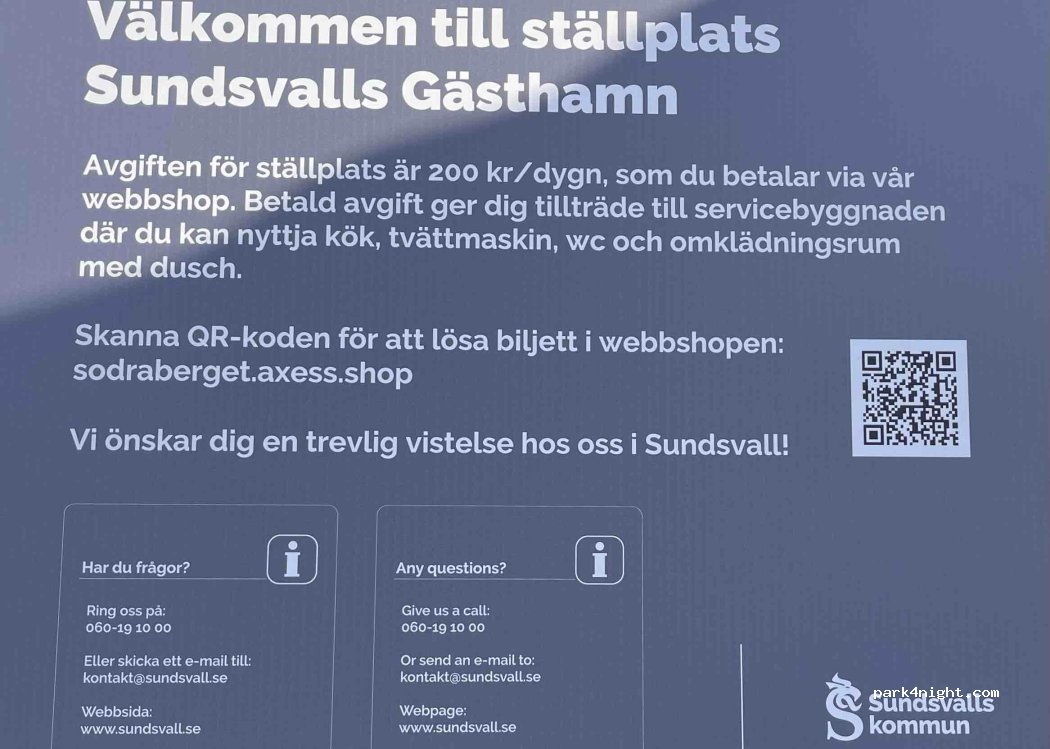 Les places de stationnement sont situées dans la partie intérieure du port, au centre de Sundsvall (à Nya Hamngatan, à l'extrémité du quai, avec la mer comme voisin immédiat et vue sur Sundsvallsfjärden).