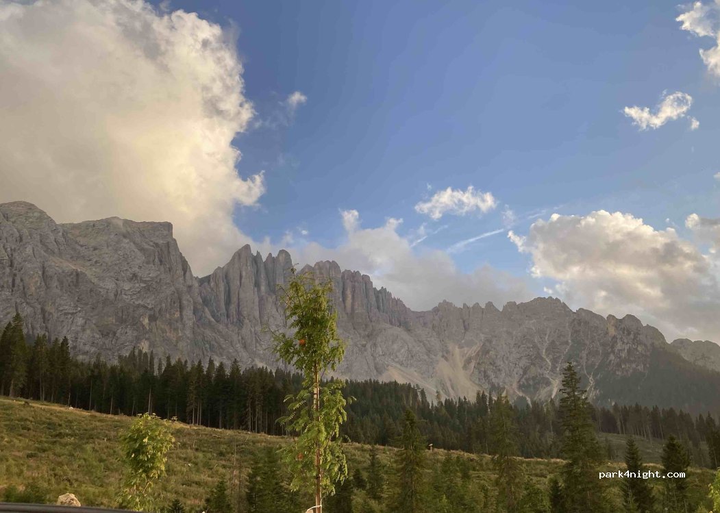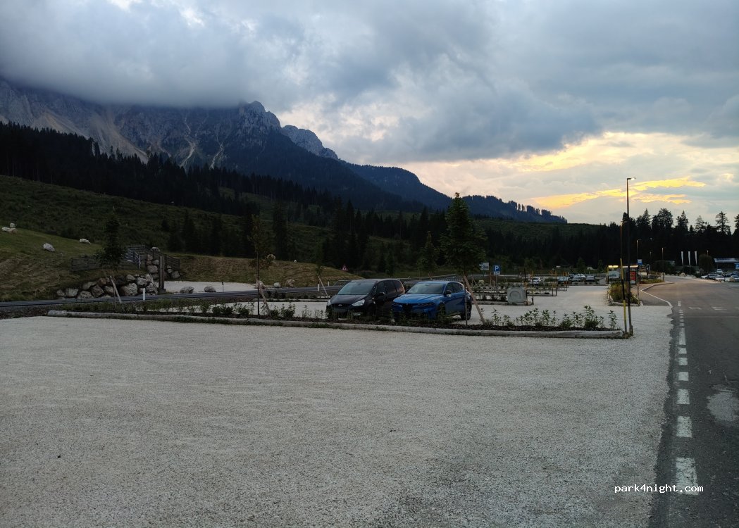 Emplacement gratuit jour et nuit (pour le moment) nous avons très bien dormis et en sécurité, la vue au réveil etait magnifique, le lac de Carezza est à 20 minutes à pied. Beaucoup de camper forcément mais tres respectueux, poubelle, point d'eau et toilettes.