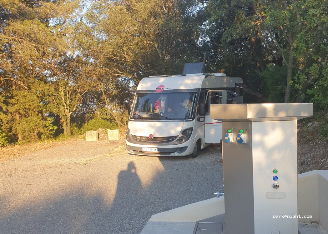 Belle aire bien aménagée, avec une petite vue sur les ruines du château. Contrairement au descriptif, c'est 3h d'électricité 10A pour 4€. La borne se commande directement depuis votre smartphone à l'aide d'un QR code. Je n'ai pas testé l'eau. Malheureusement, une barrière interdit la visite du château, et aucun commerces...
