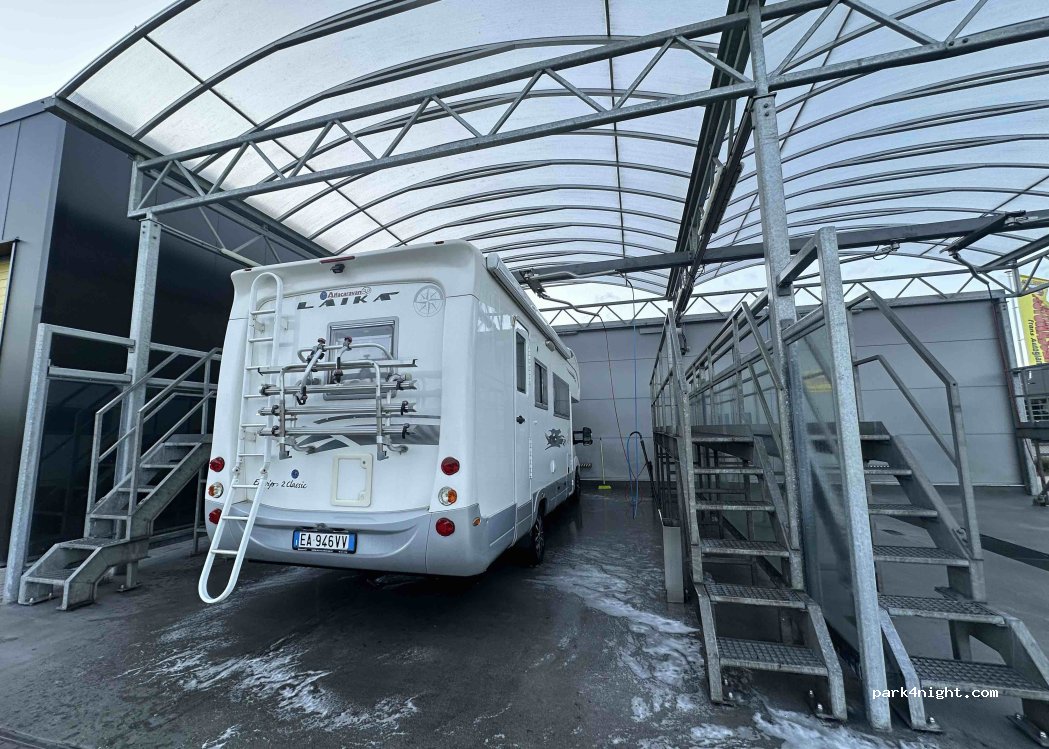 Emplacement idéal pour laver votre camping-car. Une passerelle est présente pour nettoyer le toit. Placez votre camping-car près de la passerelle pour accéder à l'ensemble du toit.