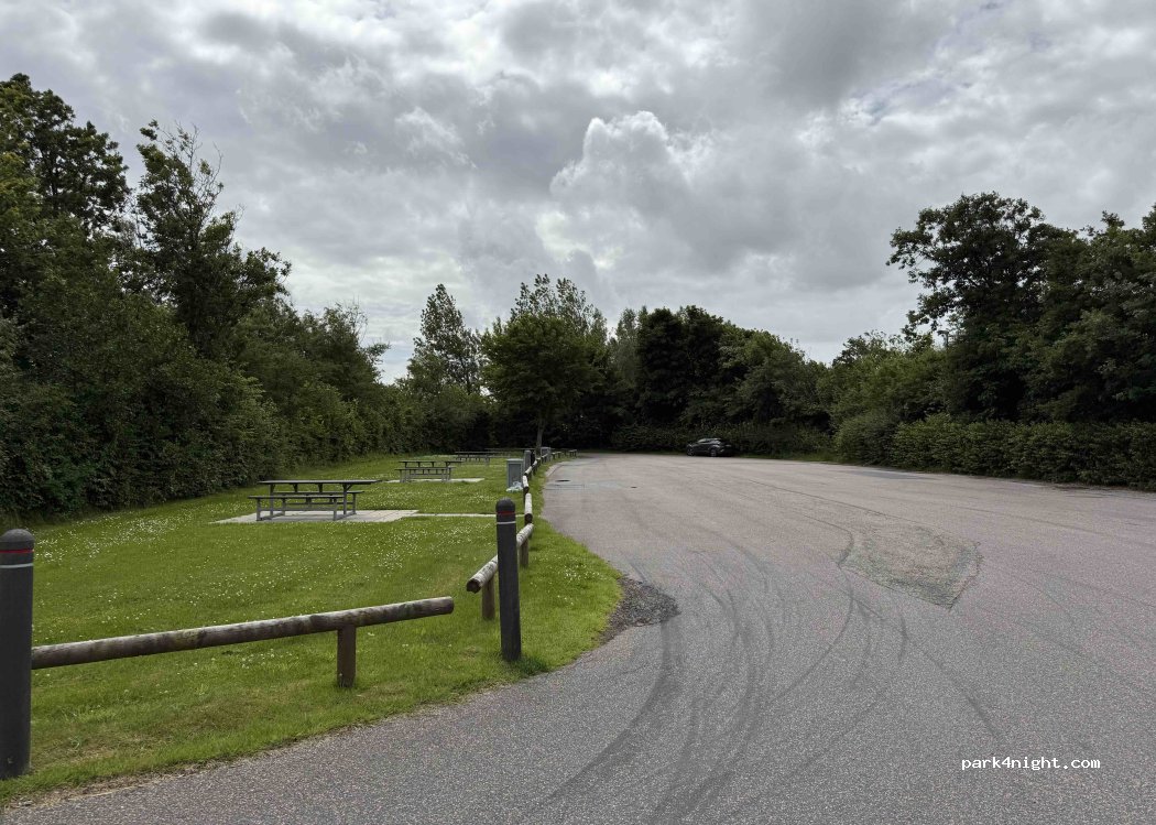Aire de repos pavée. Séparée de la route par des arbres. Toilettes et tables de pique-nique sont disponibles.