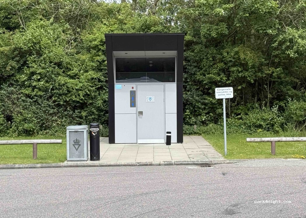 Asphaltierter Rastplatz. Von der Straße mit Bäumen abgetrennt. Toiletten und Picknicken Tische vorhanden.