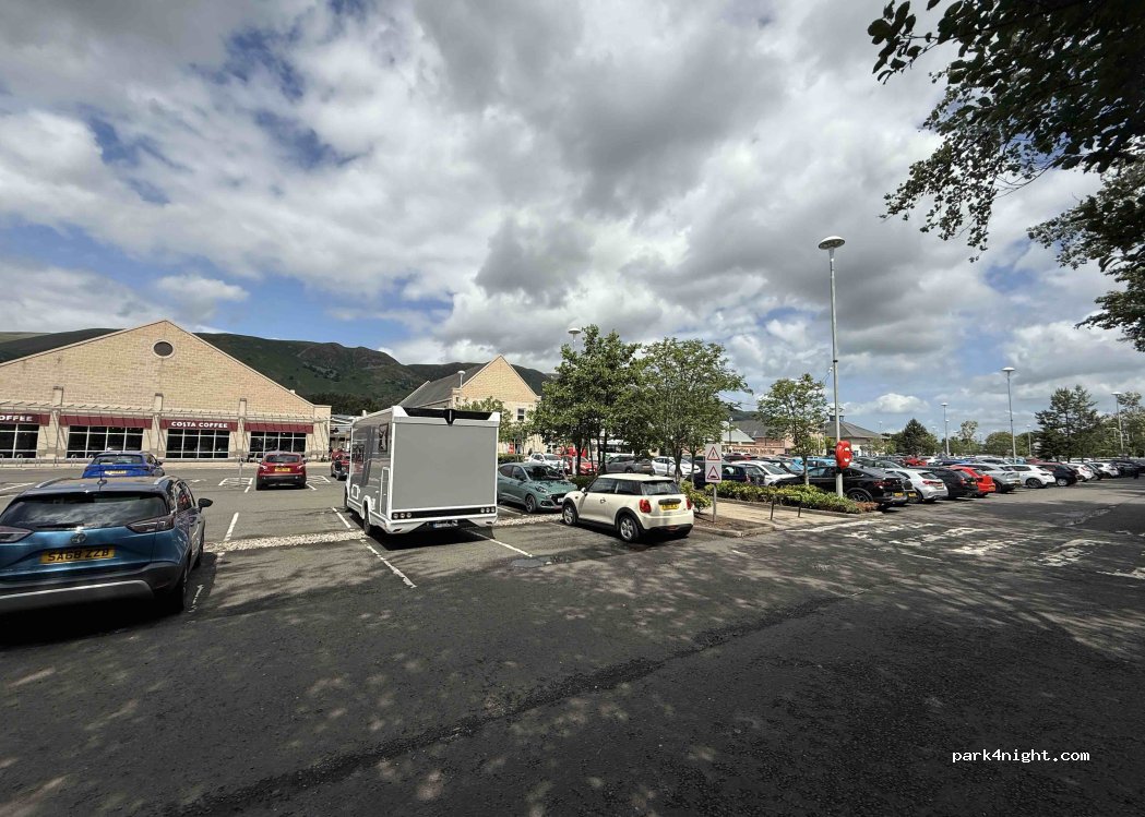 Large parking lot at an outlet store. No signs prohibiting parking. At the end of the parking lot, there's a row where you can drive your RV through. We were able to sleep peacefully and undisturbed one night. The next day, we explored the outlet grounds and spent more money there than we would have at a campsite. ;-) We're currently traveling with a 7.19 m RV.