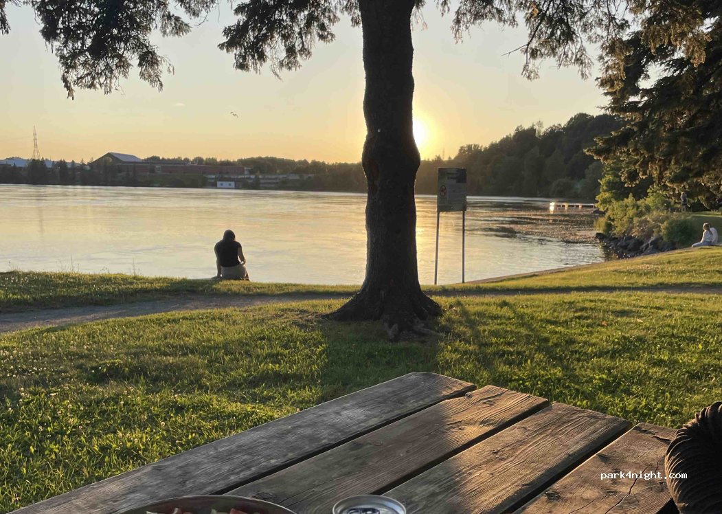 Estacionamiento gratuito las 24 horas con hermosa vista al río y mesas de picnic. Tranquilo y seguro. Baños públicos a 200 m, abiertos de 6:00 a. m. a 11:00 p. m., con agua potable.