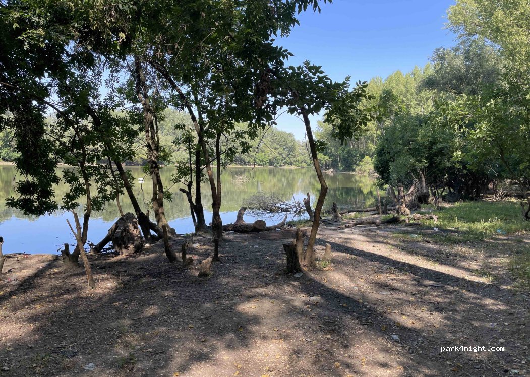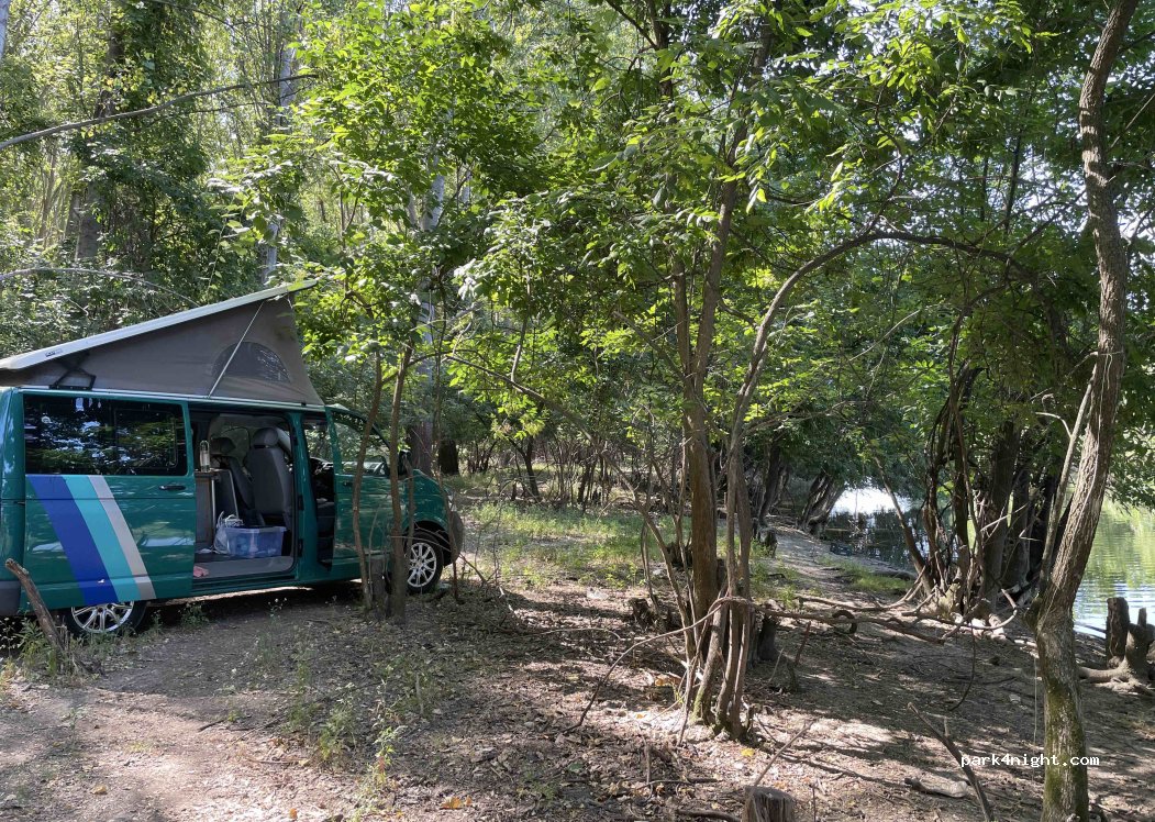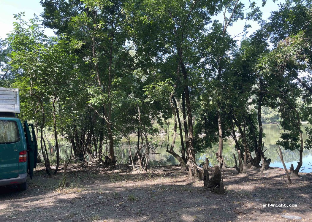 This is a very pleasant fishing spot just outside the town of Kovin, on one of the small Danube canals. It's an off-road spot, but nothing complicated; our VW T5 worked perfectly. The locals fish here, but they won't bother you; they kept their distance, and we barely exchanged a few words. There are lots of animals, so you might hear foxes at night and find droppings. The water is ideal for swimming. You should turn off when you reach the marina, go around it to the left, and continue through the forest until you see water on your right; there will be an off-road path that leads directly to the water.