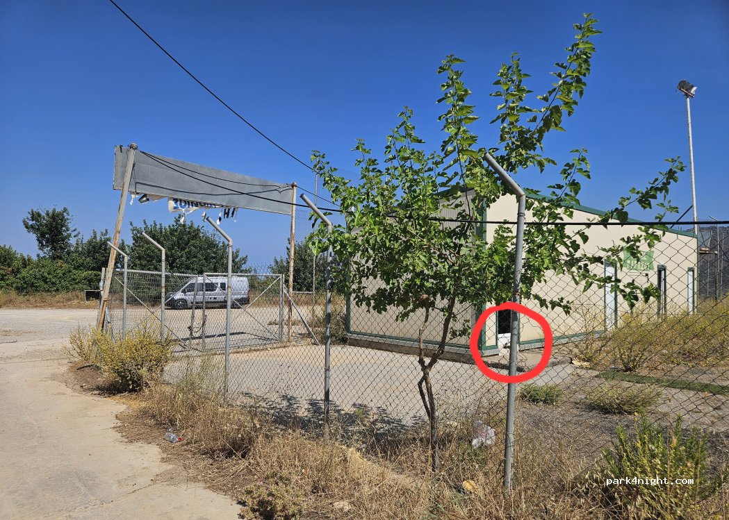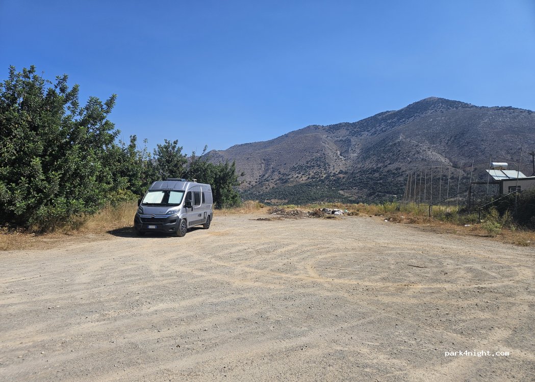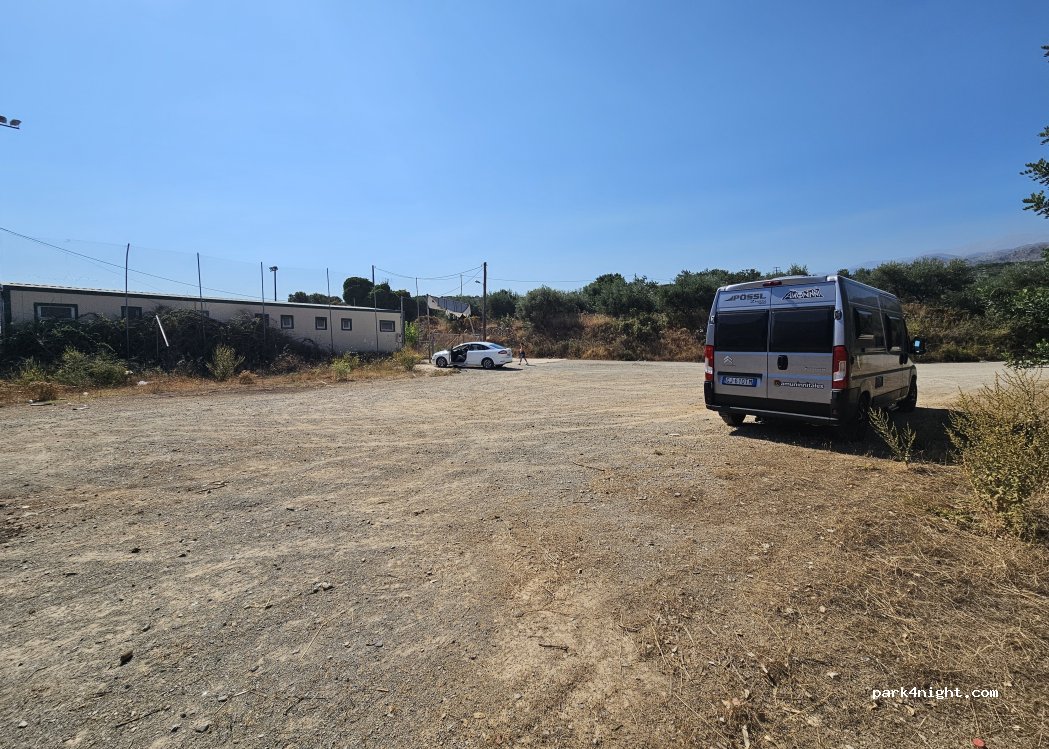 Dirt parking lot next to the soccer field in Garazo. Very quiet at night. There's a water tap under the mulberry tree along the fence (see pictures). Garazo is a small village that has a cute old centre to explore on foot. This parking lot is also 5 minutes walk away from Mina's Taverna, a wonderful local restaurant. Unfortunately when we stayed here, there were some piles of trash abandoned at the far end of the parking lot. Hopefully they will clean that up.