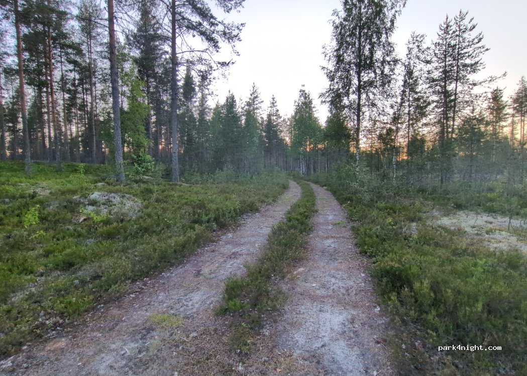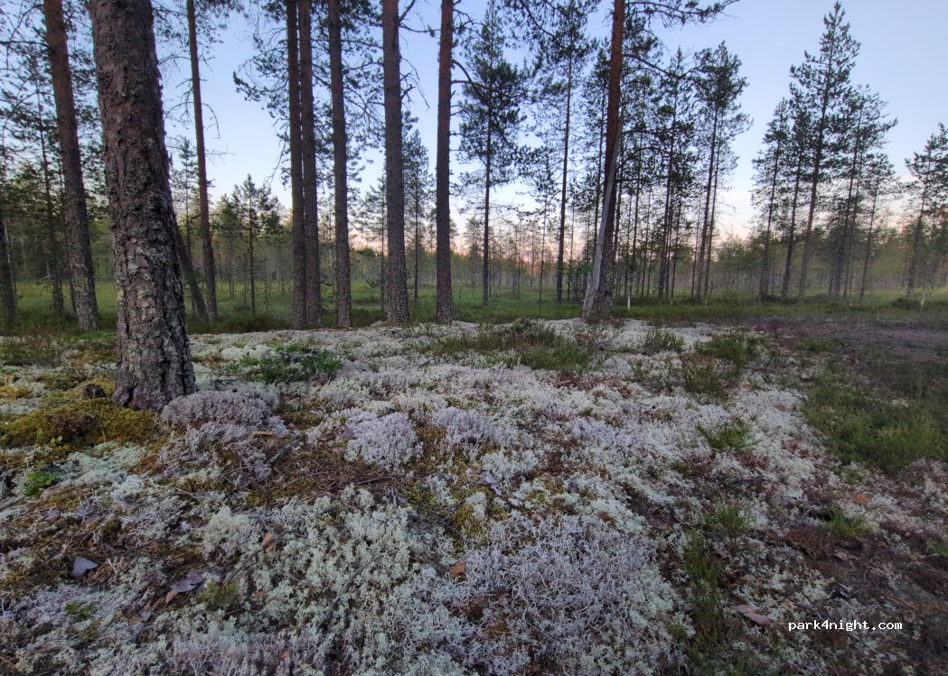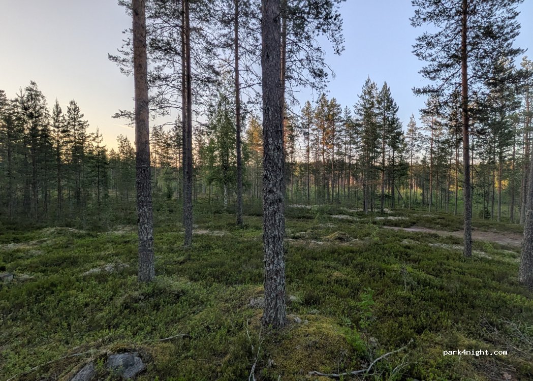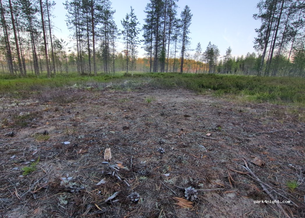 A beautiful, absolutely quiet spot in the middle of the forest, surrounded by sparse pine trees, low shrubs, and moss-covered ground. The ground is level and offers enough space for off-road vehicles, vans, or small campers.