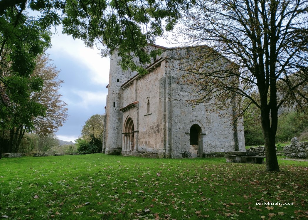Lugar muy tranquilo y bonito. No hay apenas tráfico. Sin servicios pero una fuente cercana. Zona de picnic al lado. El monasterio y el lugar merecen la pena. Supongo que en fin de semana tiene que haber mucha gente.
