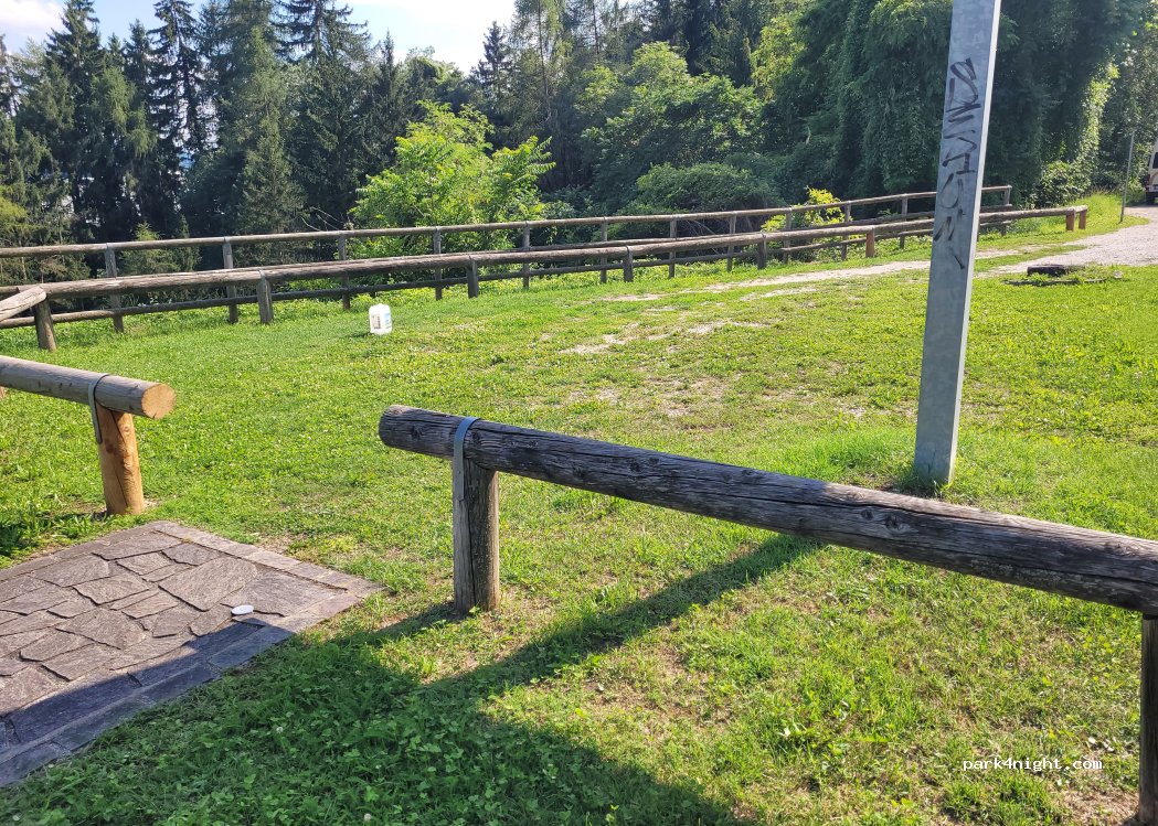 Precioso lugar de picnic con mesas y bancos, césped y árboles. Hermosa vista del pueblo.