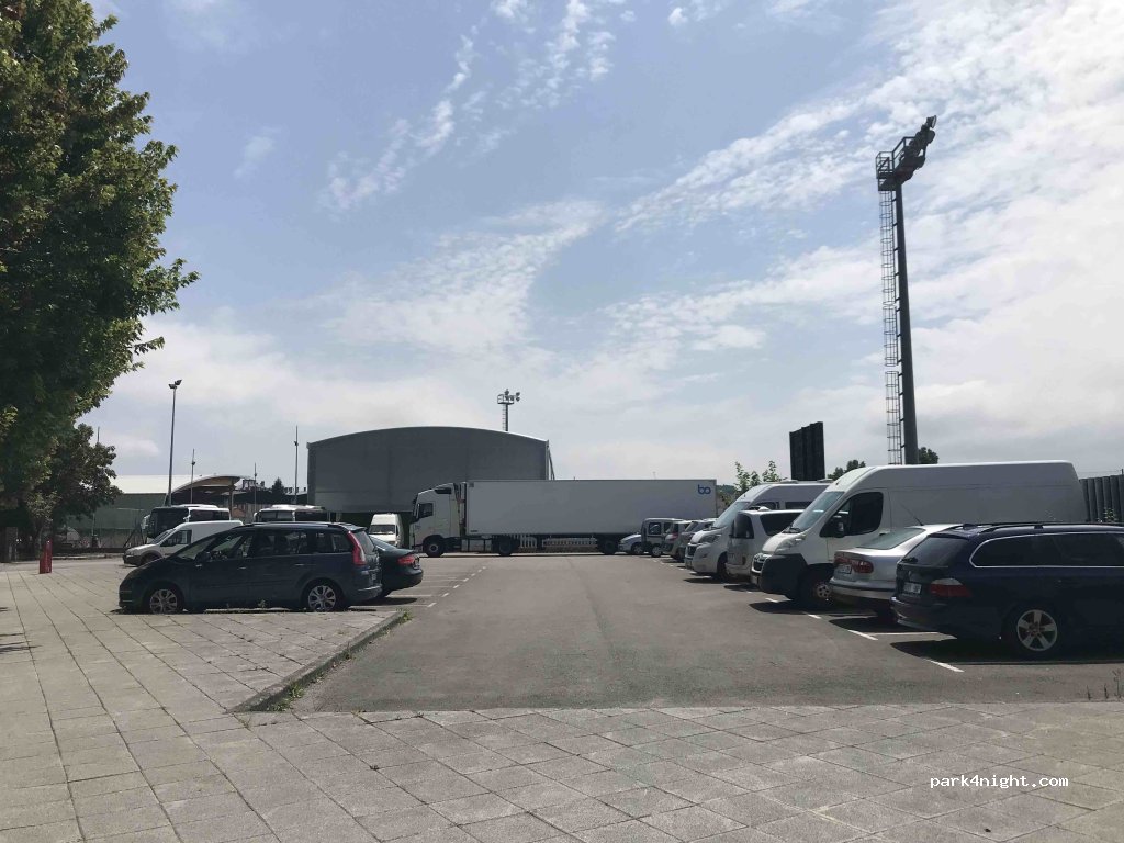 Sitio para aparcar y pernoctar con plazas largas. Hay una gasolinera enfrente y un parque donde vienen perros a jugar con los dueños. Por la noche apenas hay tráfico.