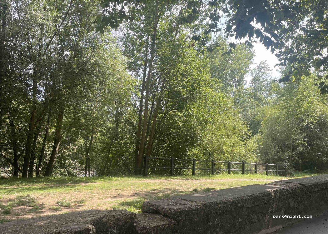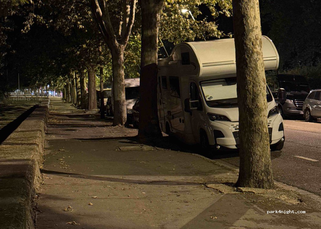 Strada tranquilla affiancata al parco, abbiamo trovato subito il posto e parcheggiato lì per visitare il centro (15/20 min a piedi) Essendo un po’ pendente (bordo strada) ci siamo spostati dopo cena all’area sosta camper più lontana ma molto ampio (i posti ce n’erano anche arrivando di sera tardi)