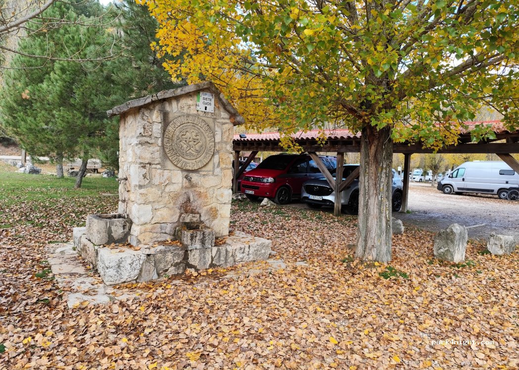 Parking du Pont des Sept Yeux pour faire de la randonnée dans les gorges du Rio Lobos. Espace détente avec fontaines et tables.