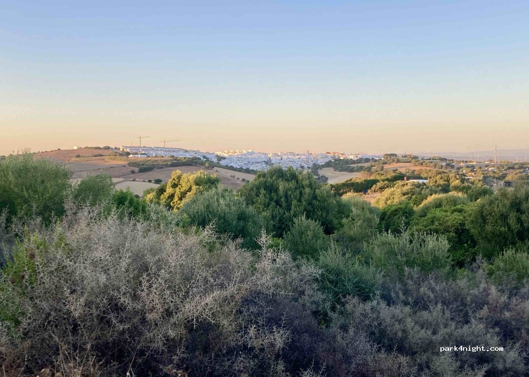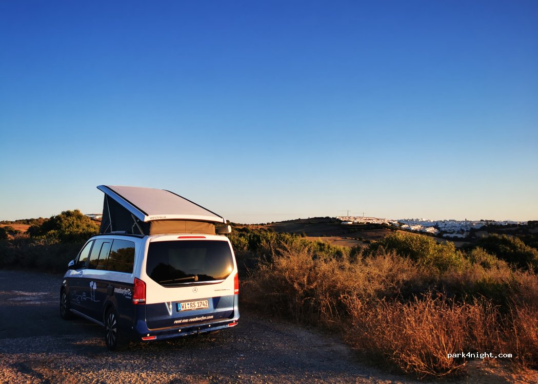Un joli spot avec vue sur Vejer, sur un parking en terre, avec pas mal de passages de locaux qui promènent leurs chiens et beaucoup de déchets sur les bas cotés. Les chiens des alentours ont aboyé toute la soirée.