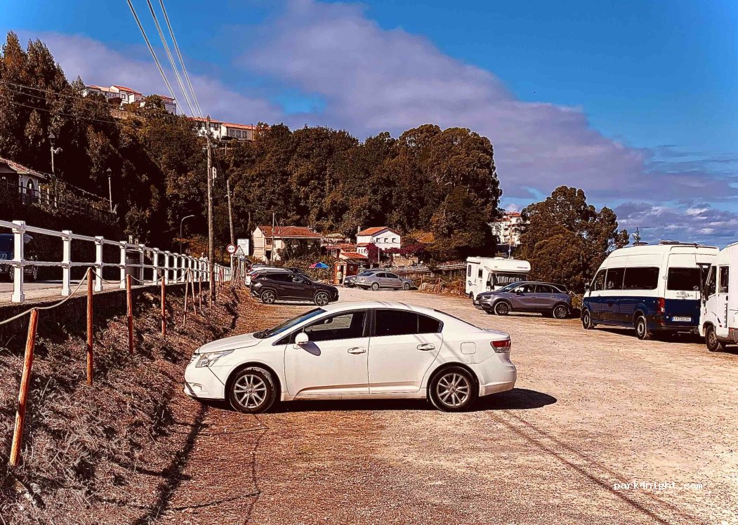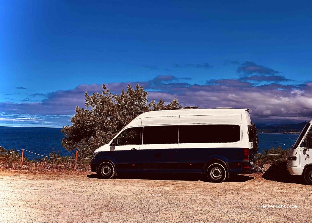Privatparkplatz (überwiegend für PKW) mit Kassierer in Häuschen am Ende eines Dorfes. Herrliche Aussicht aufs Meer. Kein Schatten. Direkt neben der Straße. Nur für komplett autarke Wohnmobile. Zur Bucht mit Badestrand führt ein steiler Weg.