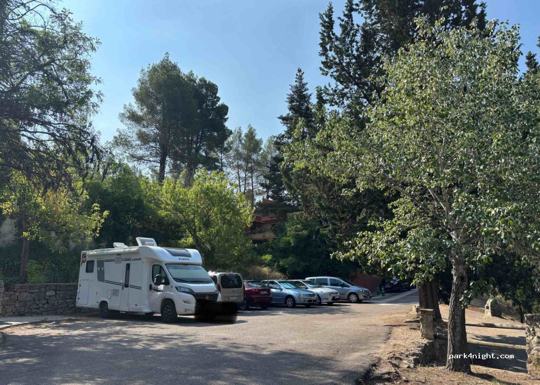 Hablado con el personal del ayuntamiento que controlan en verano los accesos al Azud. Se puede pernoctar y aparcar solo en este lado del azud. En la carretera del bar no se puede acceder porque a las nueve ponen cadena. Yo he pernoctado al lado del bar pero he tenido que sacarla a las nueve y venir a este parking. En verano cobran 5€. Si vienes tarde y pernoctas al dia siguiente te informan de que tienes que pagar. 300m antes de llagar a este P hay uno muy grande pero todo inclinado.