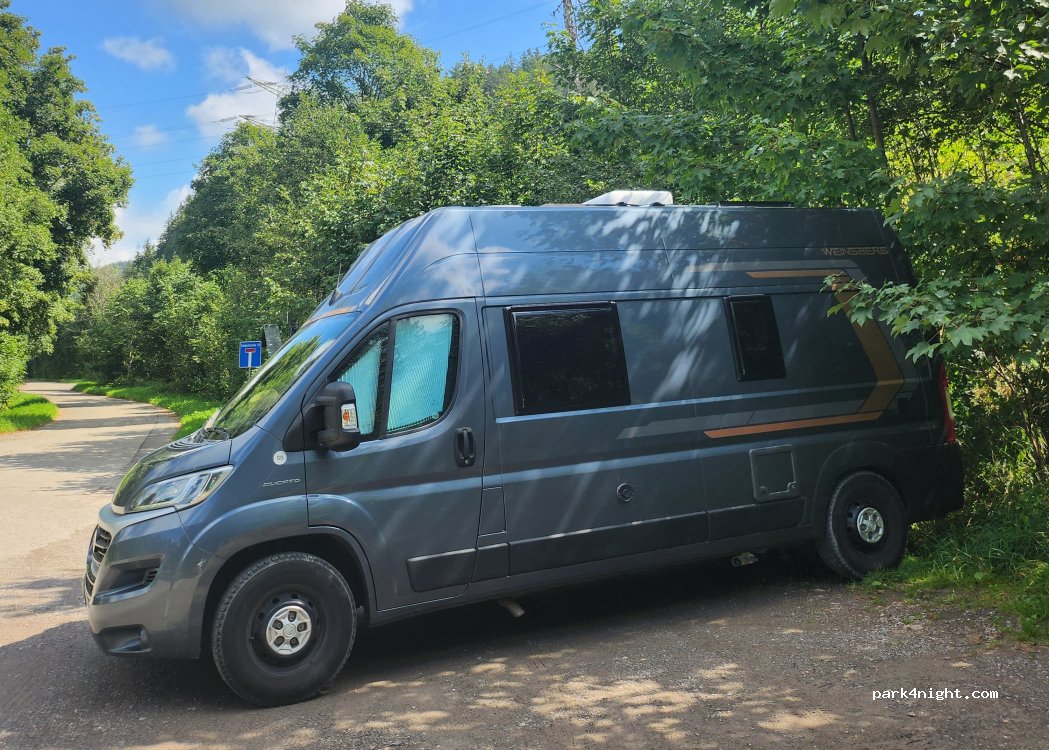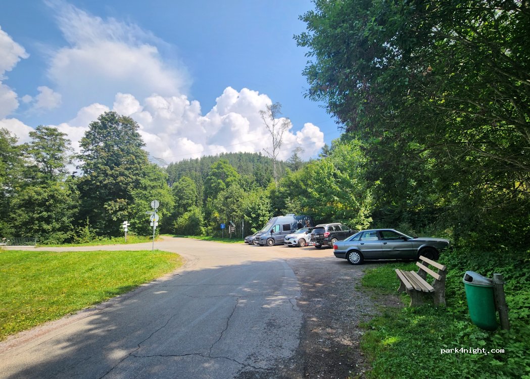 Pequeño parking, justo al lado de senda de río y árboles para ir al lago en 10 min en un agradable paseo. No figura prohibición alguna de aparcamiento, acceso limitado por puente de 3,20m...abstenerse Ac mal altas. Es gratuito a 3 min del área de pago conmñ parkimetro. Tiene algo de sombra por árboles en la parte trasera.