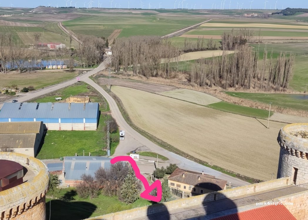 Parking en terre autour du château de Torrelobaton. On dit que le château est le mieux conservé de Castille-et-León, une visite est obligatoire. La ville se trouve à 50 mètres et comprend, entre autres, une église impressionnante (l'intérieur est incroyable), une place et des piscines municipales agréables.