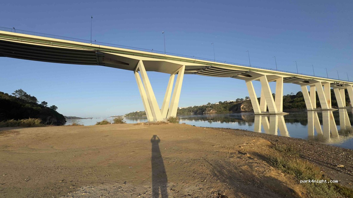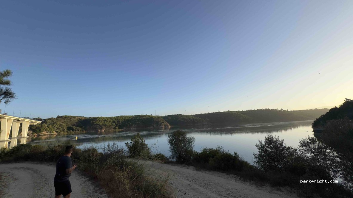 Zone P liegt weiter unten. Wir aßen zu Abend und übernachteten dort. Am Morgen kam die GNR, begrüßte uns, sagte aber nichts. Es ist ein ruhiger Parkplatz am Fluss unterhalb der Brücke. Wir probierten den oberen, der ebenfalls eben ist, aber dort fuhren ständig Autos vorbei, also entschieden wir uns, dorthin zu gehen. Es ist eine holprige Schotterstraße, die steil erscheint, aber mit der 7,60 m langen AC schafften wir es problemlos bergab und bergauf.