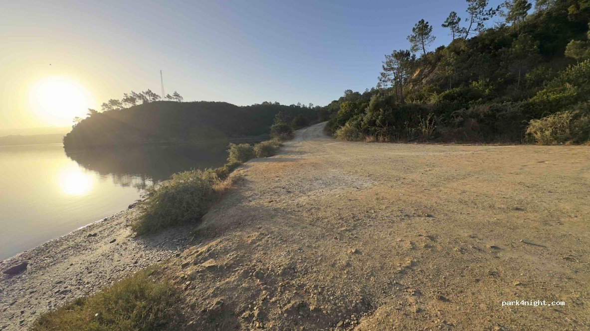 La zone P est plus bas. Nous avons dîné et passé la nuit. Au matin, le GNR est arrivé, nous a salués, mais n'a rien dit. C'est un parking tranquille près de la rivière, en aval du pont. Nous avons essayé celui du dessus, qui est également plat, mais les voitures passaient sans cesse, alors nous avons décidé d'y aller. C'est un chemin de terre accidenté qui semble raide, mais avec les 7,60 m de dénivelé positif, nous avons réussi à descendre et à remonter sans problème.