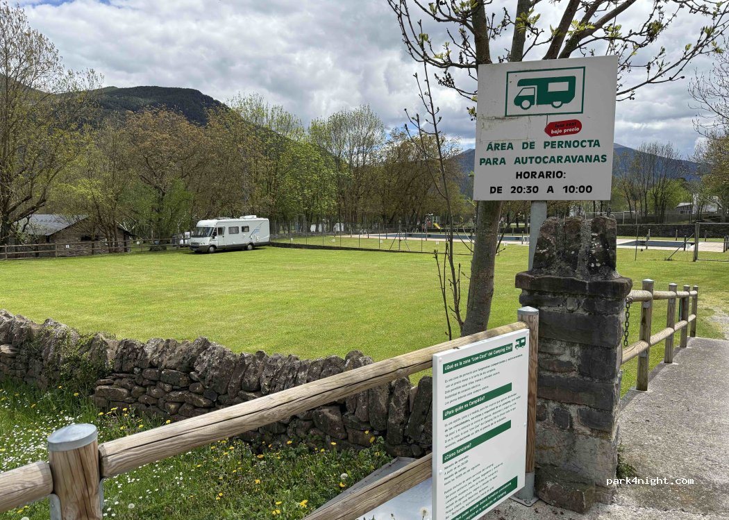 Hemos pasado un par de días, tiene una zona para autocaravanas a la entrada perfecta de hierba, con aceso directo a la piscina, con tarifa de pernocta de 20:30 a 10:30 aunque nos dieron flexibilidad con el horario, sitio perfecto para hacer las ferratas de Broto, para nosotros recomendable