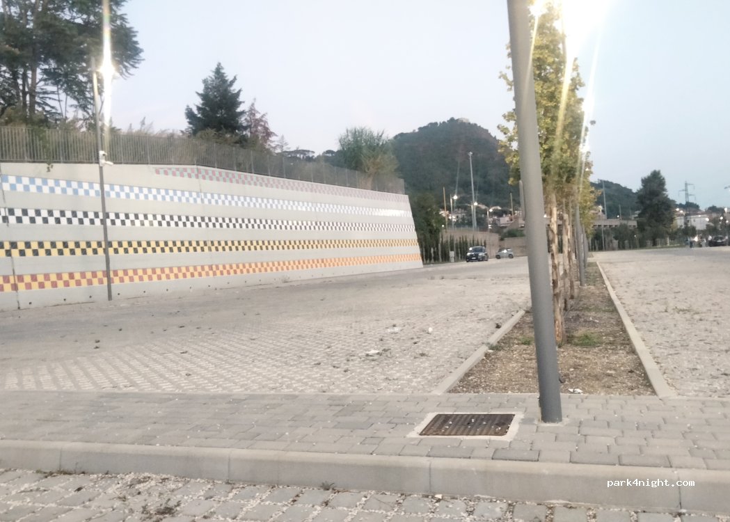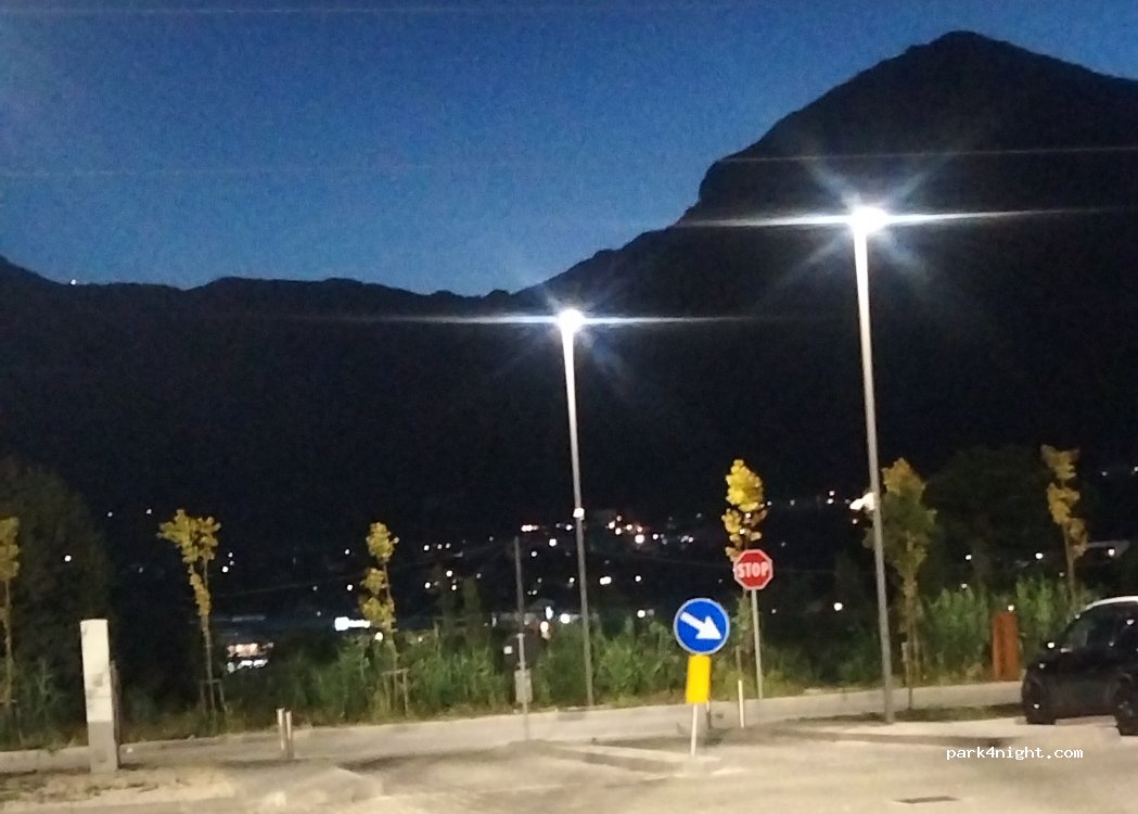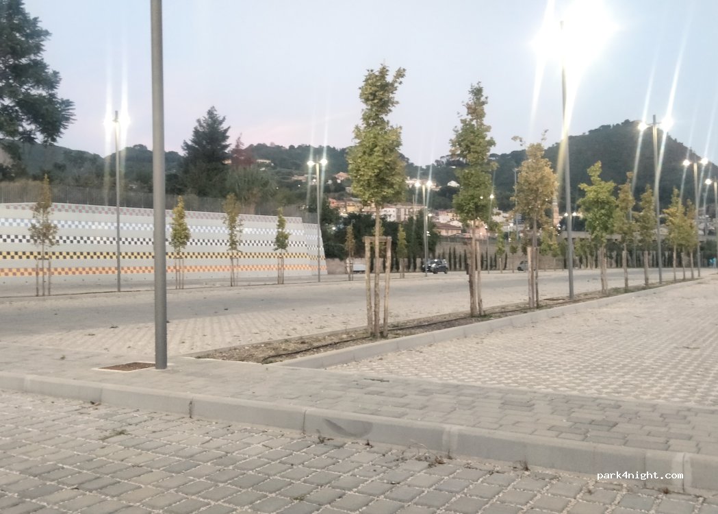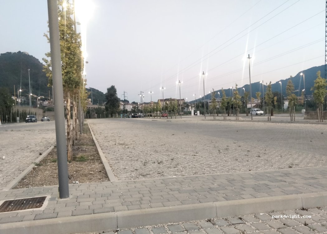 Parking éclairé toute la nuit. Très grand. Plat. Calme. Peu de voiture s'y gare. Par contre la grande entrée principale était fermé on a du passer sur un côté. C'était difficile avec notre CC de 8m, on a touché des panneaux de circulation.