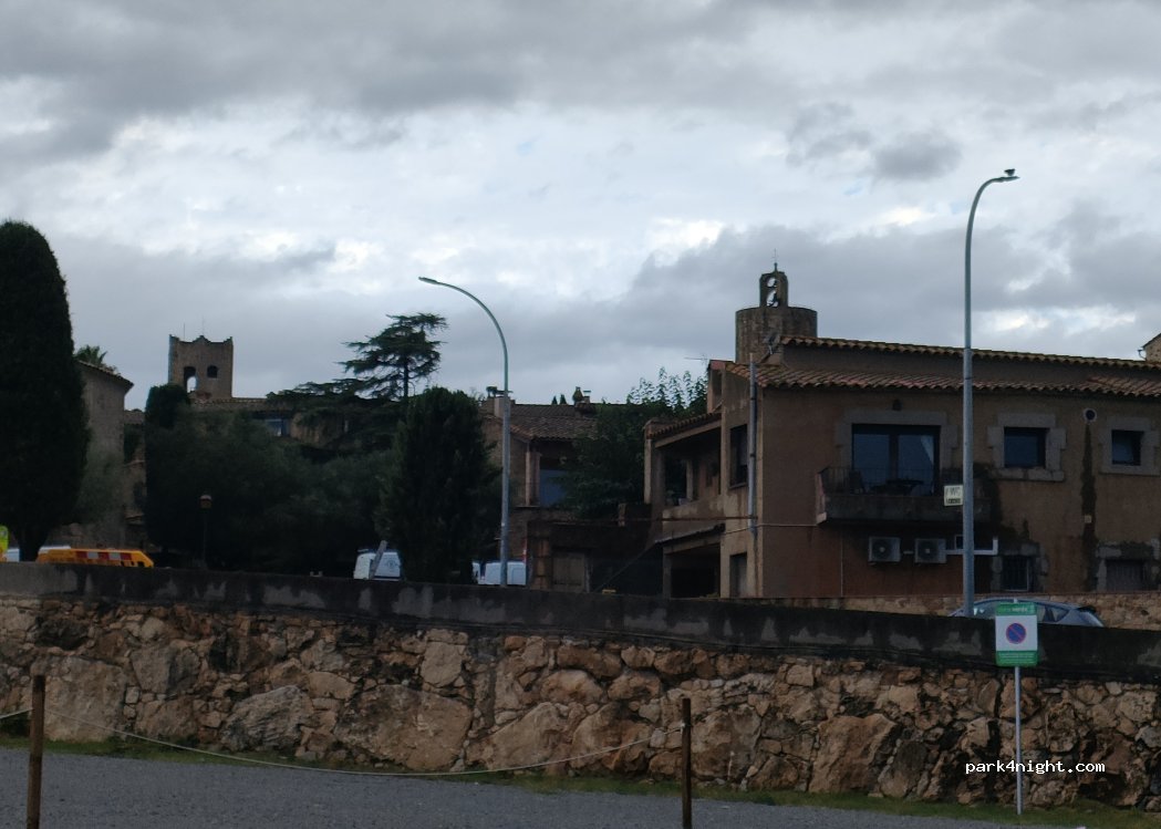 Neuer Parkplatz 50 m vom Rathaus von Pals entfernt. Abseits der Hauptstraßen, mit Blick auf die Altstadt auf der einen Seite und grüne Landschaft auf der anderen. Es handelt sich eher um einen Campingplatz für Vans oder Oldtimer, da es am Ortseingang einen speziellen Parkplatz für Wohnmobile gibt.