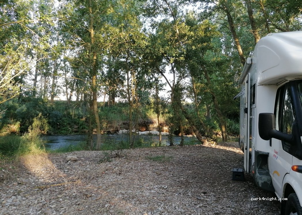 Oase midden in het droge Spanje! Veel plek ook voor grote campers. Heerlijk riviertje om af te koelen en onder de bomen dus altijd schaduw. Niet ver van de snelweg. Route stuurt je over de brug. Voor de brug bordjes van de kano vereniging volgen. Kort ongeasfalteerd weggetje.