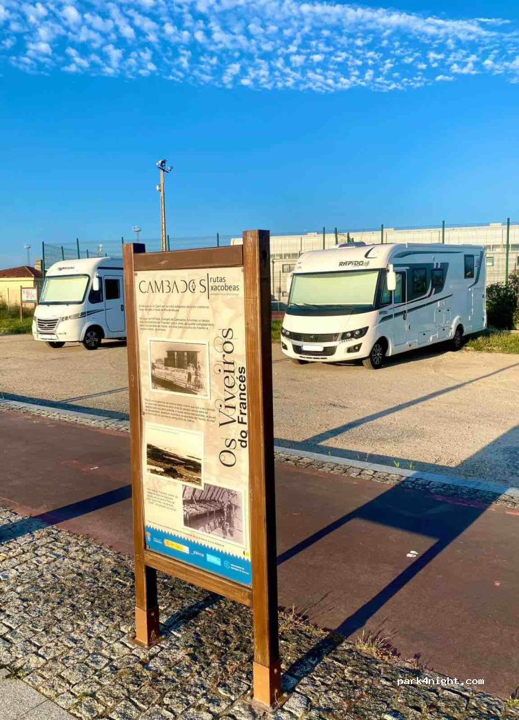 A good place to park, park and spend the night in Cambados. Wednesdays and Saturdays are market days and the port parking lot will be closed to traffic and full of stalls or booths. This place is compacted, level earth. It is very quiet and is next to the sports center. The promenade and cycle path begin right here and it is very close to the Tragove tidal mill. Laundry 500 m away. The water tap is behind the containers.