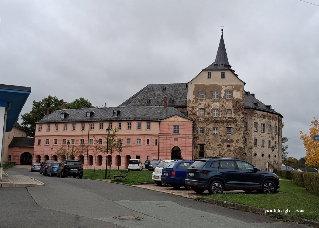 Parkplätze am stillgelegten Bahnhof auf Asphalt. 5 Min. Fußweg zum Schloss und Einkaufsmöglichkeiten.
