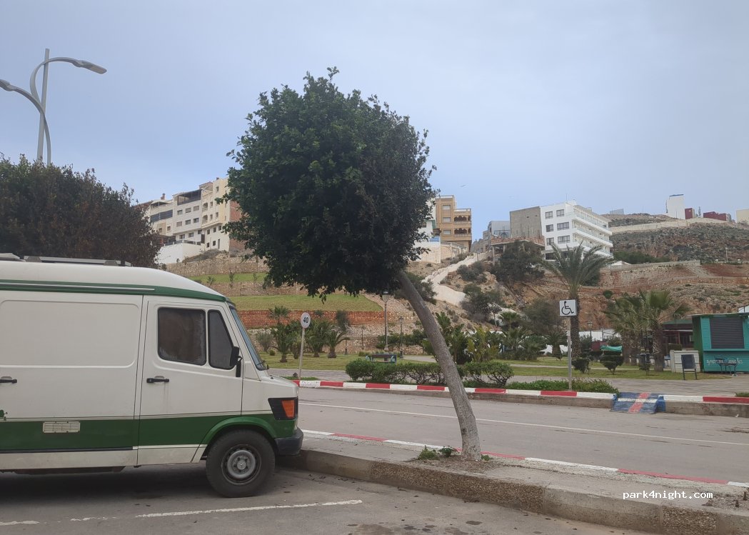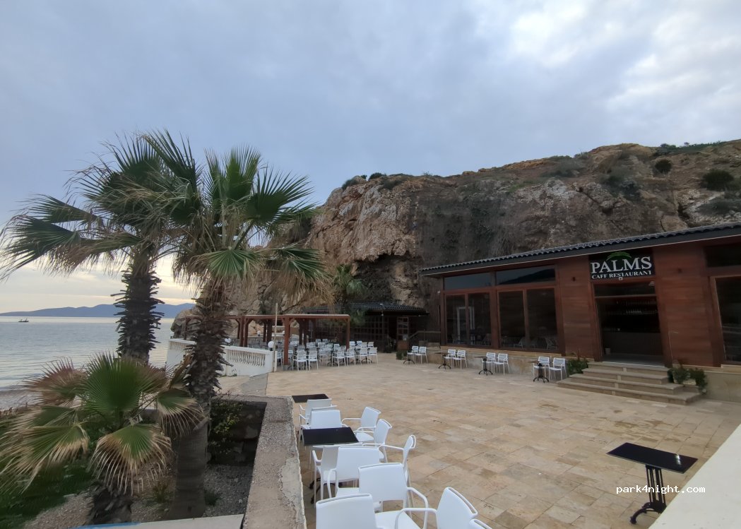 Stay overnight right next to the beach restaurant/cafe "Palms". Very friendly team, very good food. The restaurant's restrooms are open 24 hours and can be used; the parking lot is monitored by the restaurant's night watchman.