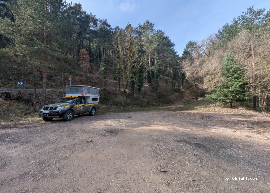 Pequeño aparcamiento de tierra al lado de la carretera. Está cerca de los aparcamientos más grandes, pero es más llano (se puede nivelar el vehículo sin usar cuñas). Está en la curva de la carretera pero pasa muy poco tráfico (de noche nada). Muy tranquilo, buena señal 4G/5G. Un pequeño camino sube a la capilla de la Sagrada Familia (unos 50 metros).