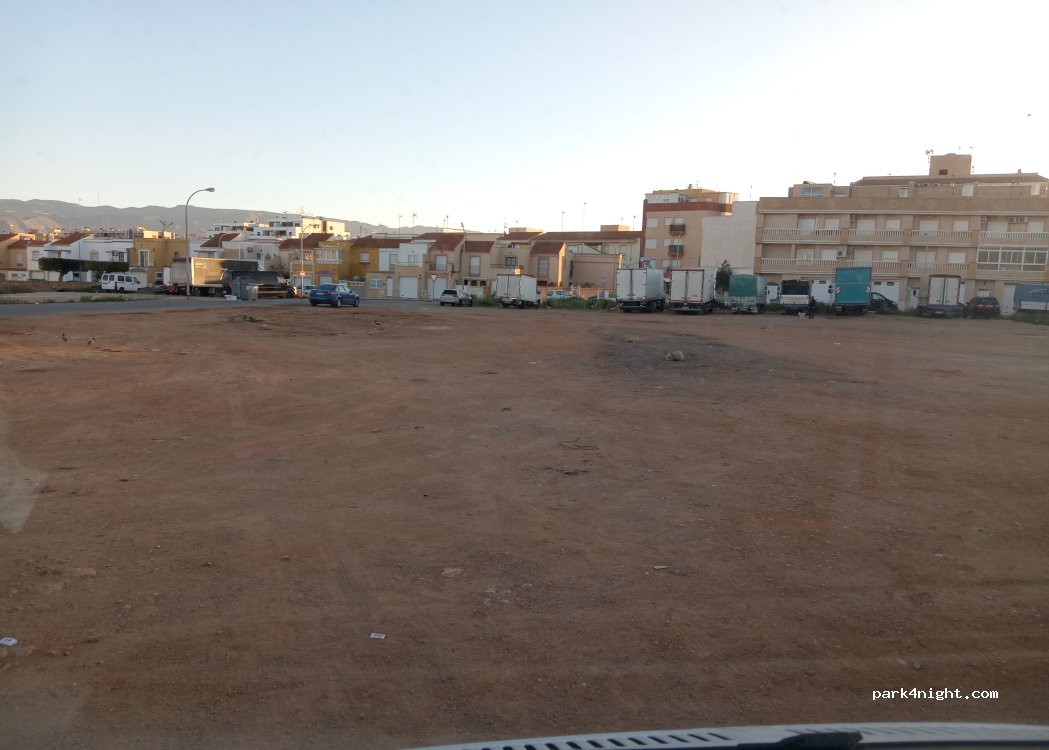 A dirt parking area in the middle of town, close to shops, with accessible rubbish bins for all sizes of motorhomes, even heavy goods vehicles with trailers.