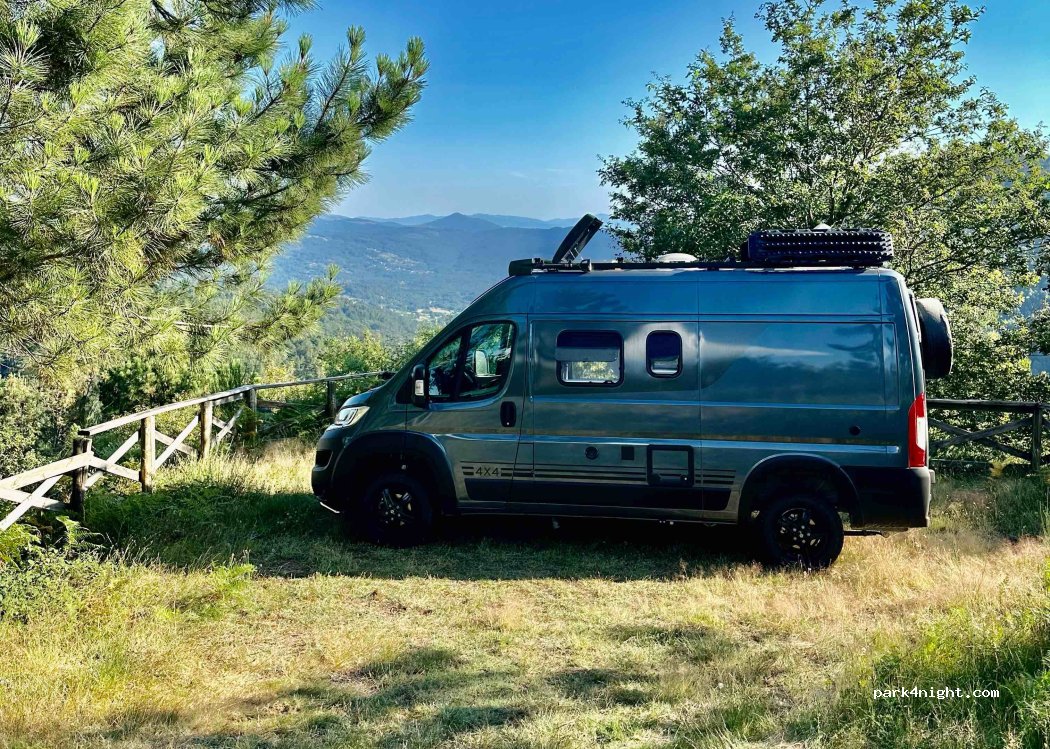 Parking in the middle of this fantastic nature and at the Mirador Chan de Correiro. A beautiful and peaceful spot from where you can start a trail through the mountains. The area is not flat, not tarmacked and just a simple spot. Picknicktables are just 50m away. Quiet through day and night. The road PO255 is curvy and partially not in a superb condition, narrow also and can be crossed by cows, sheeps and goats.
