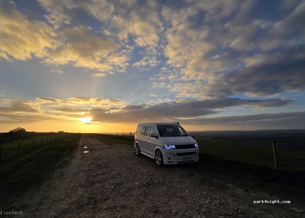 Parking on edge of Byway next to Gibbet with views of 5 counties. Very exposed, bumpy Byway access. Room for 5 vehicals. Not very Level, but with careful parking you can get level. No facilities. No Fires. Take Rubbish home. We had a few cars watching the sunset.