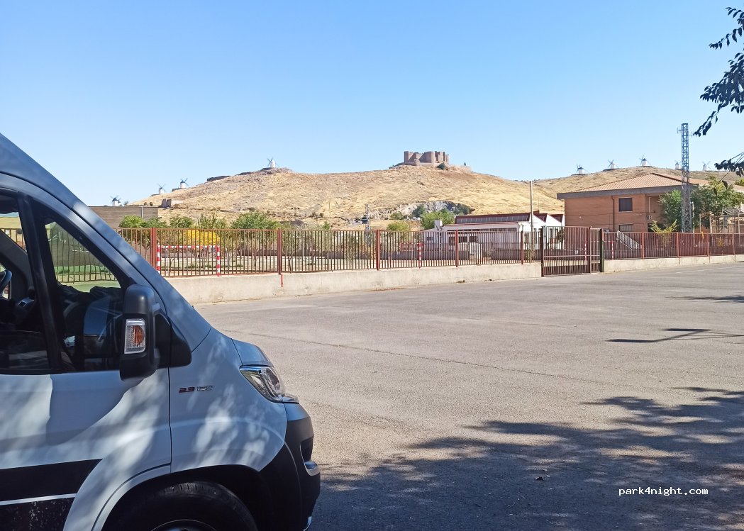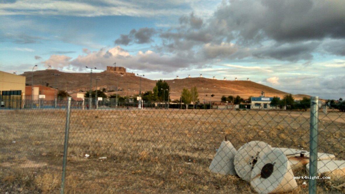 Aparcamiento junto a la piscina cubierta. Enfrente de los molinos y castillo. Sin ningún problema para pernoctar. Sitio asfaltado sin límite de altura y nivelado. Están al lado la pistas de tenis y pádel (de pago y previa reserva) y otra cancha gratuita con porterías y canastas.No hay servicios de llenado ni vaciado.