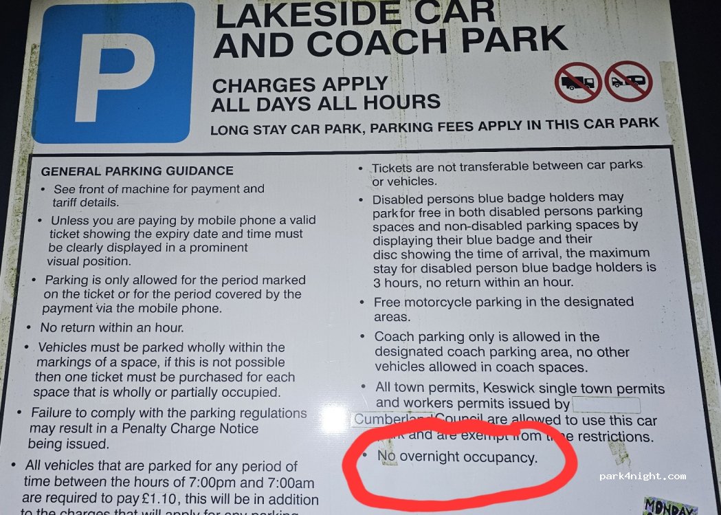 Lakeside Car Park, is not for overnight stays. The signs do state that. Stronger enforcement is planned from May 1st, and signage will be improved. Do not park overnight, you will be fined, going forward.