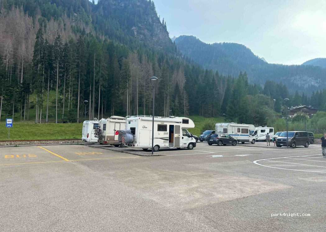 Es simplemente un parking al lado de la carretera, plazas amplias para poder estacionar, ideal para hacer la ruta de serrai de sottoguda, pasamos una noche muy tranquila ya que por la noche apenas hay tráfico, pueblo bonito con buenos comercios y restaurantes