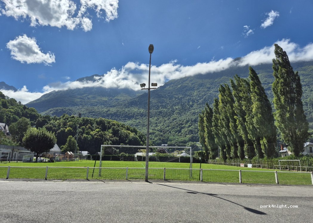 Parking très calme et plat, proche du centre, wifi gratuit dans le petit parc a côté, wc a côté du stade, wc plus propre dans un bâtiment du parc quand il est ouvert.