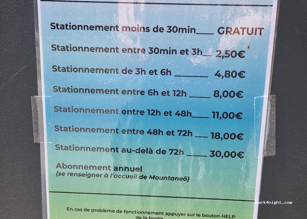 parking ouvert sans limite de hauteur et gratuit au 12/04/2024. les barrières ne sont pas encore en service. cadre très agréable. nombreuses activités et randonnées à partir d'ici. poubelles à disposition
