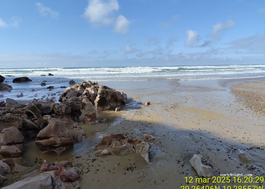 Een verlaten plek….nog geen activiteit op 31/3. Een hele aardige man zei dat we hier wel mochten staan maar dat eigenlijk de plek was gesloten. Drie lieve grote honden begroetten ons. Een prachtige plek (zonder voorzieningen) uitkijkend op de oceaan.
