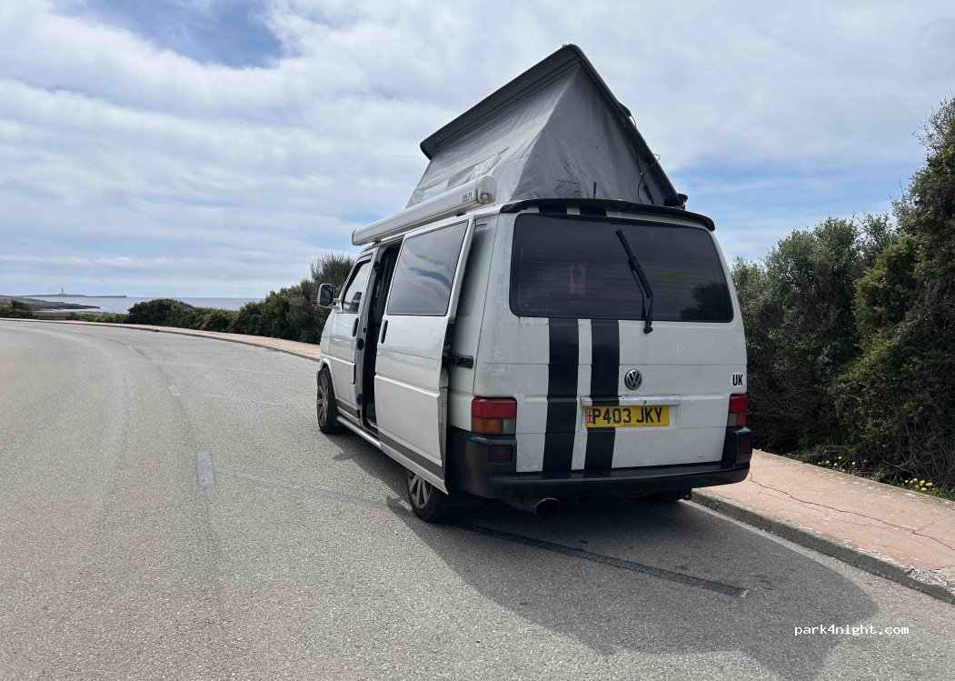 Hemos pasado alli la noche y ha sido super tranquila! Con el mar de fondo, mas furgos y autocaravanas, y a 5’ (o menos) de la playa. La verdad que es un sitio recomendable! Es una plaza de aparcar, por lo que no se deben sacar mesas y demás.