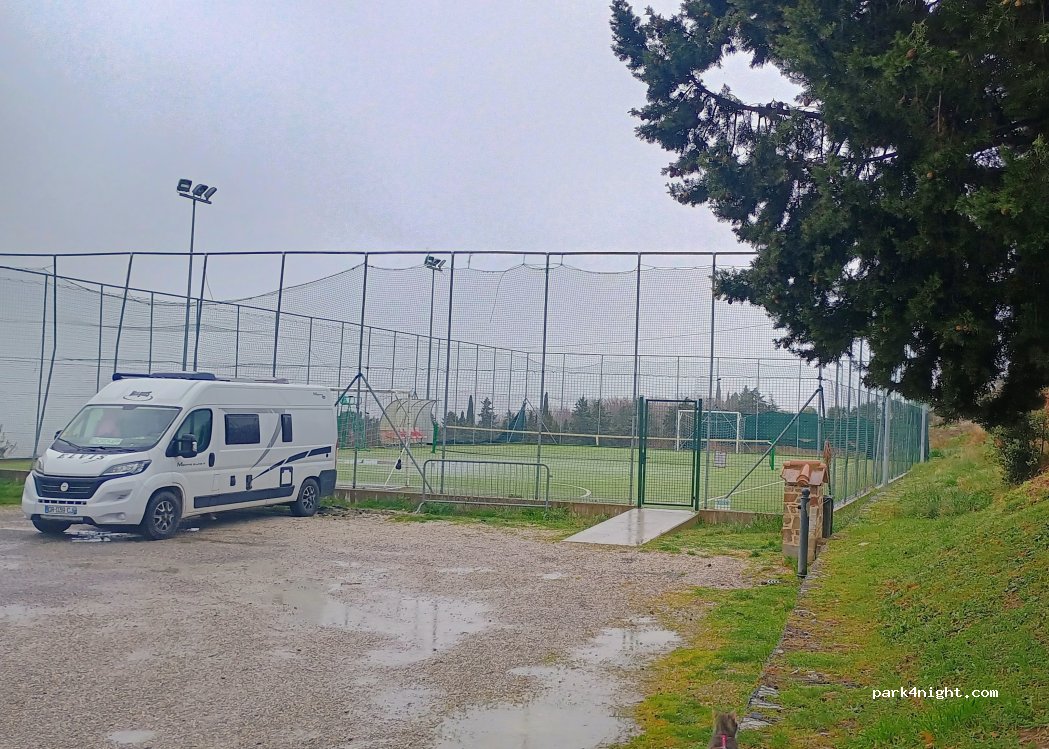 Une place calme devant un terrain de sport. Il y avait un semi remorque et un bus garés quand nous sommes arrivés qui sont partis vers 5 heures le matin. La vidange est opérationnelle ainsi que l'eau. A 200 mètres il y a même une fontaine d'eau potable pétillante gratuite.