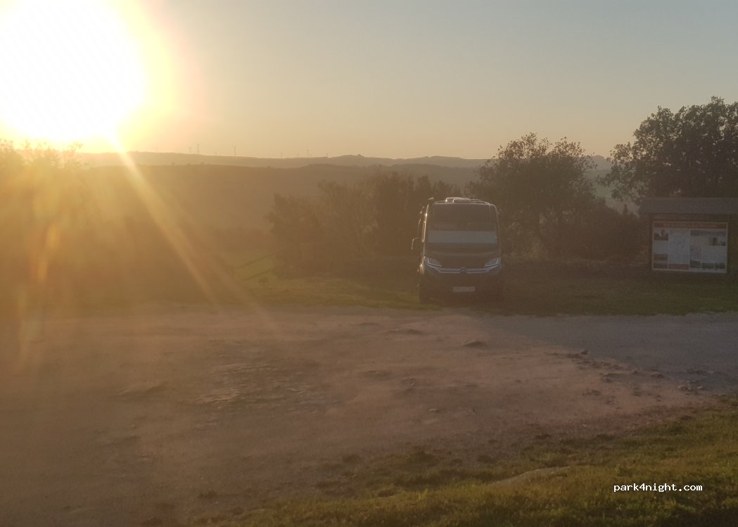 Schöner Platz mit Aussicht auf den Ort für die Nacht. Wasser, Tisch und Bank vorhanden. Leider etwas umherliegender Müll. Aber empfehlenswert, schön ruhig, gelegentlich fährt mal ein Auto vorbei. Turm war leider geschlossen.