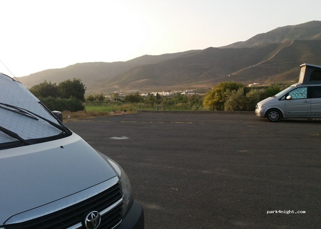 Si vous êtes en camping car,mieux vaut arriver au parking par le bas de la calle Huertas (accès un peu étroit par la haut de la rue surtout si des voitures y sont garées). Parking asphalté,relativement plat. Belle vue sur les montagnes. L'église sonne toutes les heures même la nuit. Quelques aboiements de chiens au loin. Nous y étions dans la nuit du vendredi au samedi.