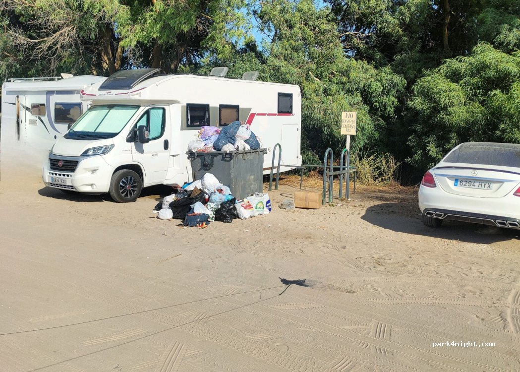 Parking de arena de playa donde te puedes quedar atascado. No hay luz ni para cambiar aguas, y si hay autocaravanas y furgonetas todo el verano no sé donde estarán tirando sus residuos. Después nos extrañamos cuando nos critican. Todo muy sucio de papel higiénico, pipis y heces. Hemos visto a la guardia civil multando. Creemos que ya no dejan sacar sillas y mesas.